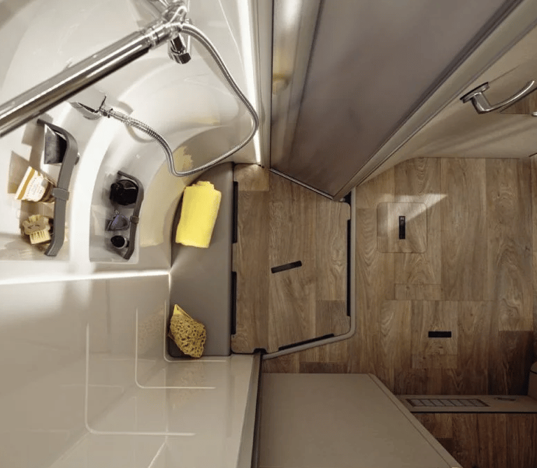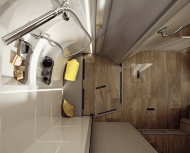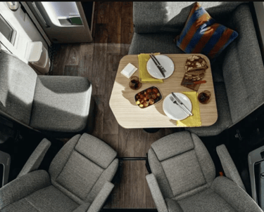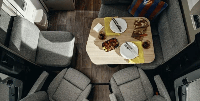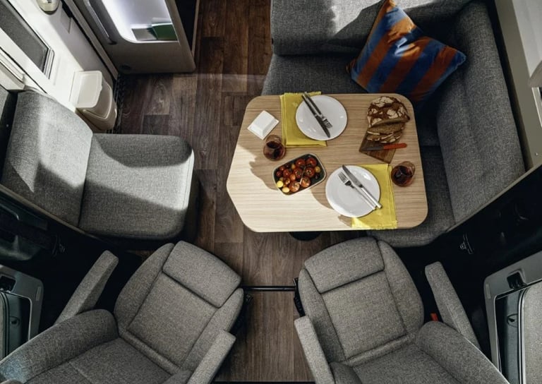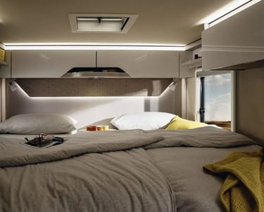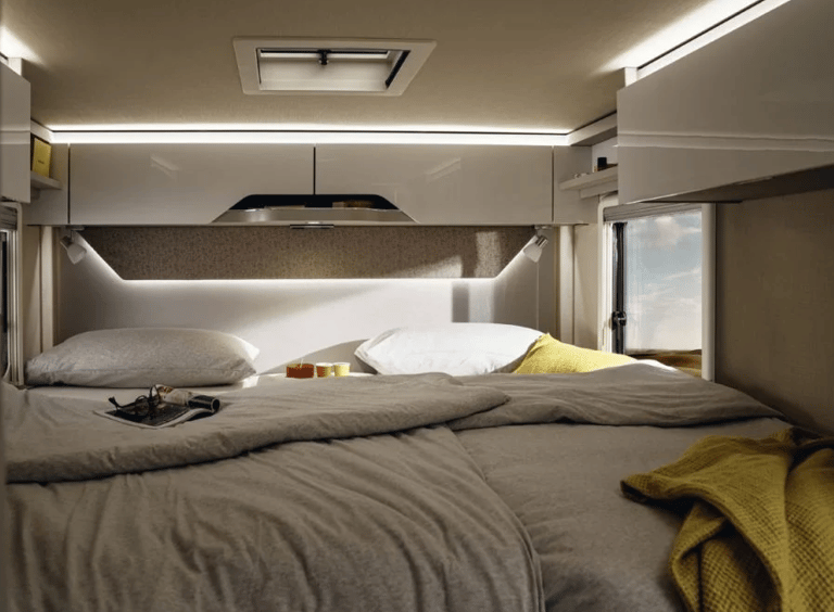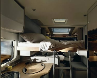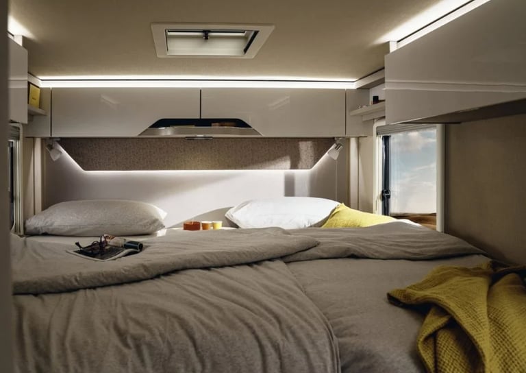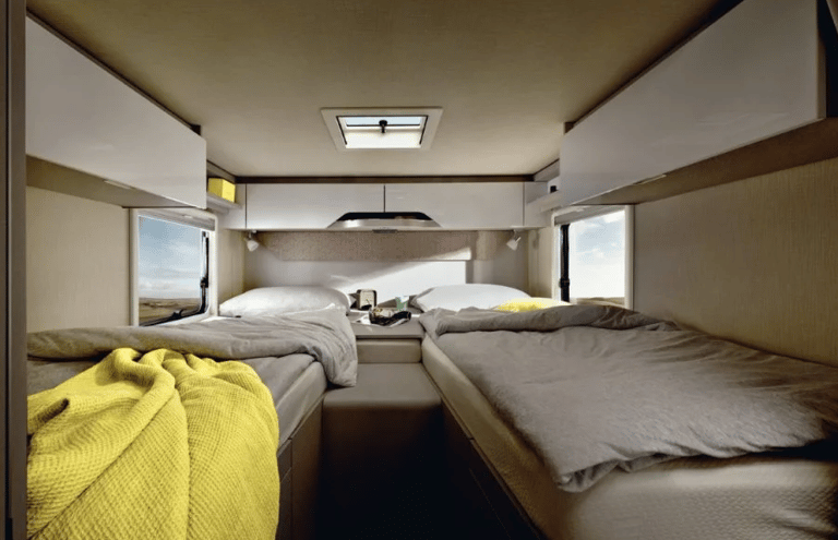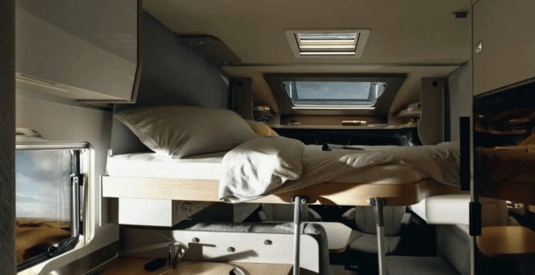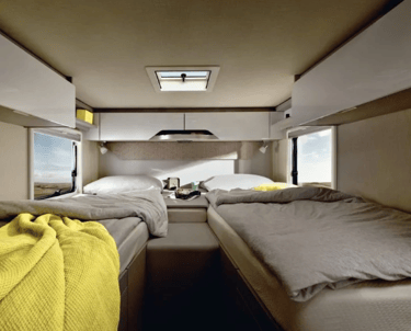 Розміри ліжок: Опускне ліжко (см): 188 × 130–105; Задні ліжка (см): 200 × 83 / 196 × 83; Центральне ліжко, трансформоване з вітальні (см): 195 × 125–40